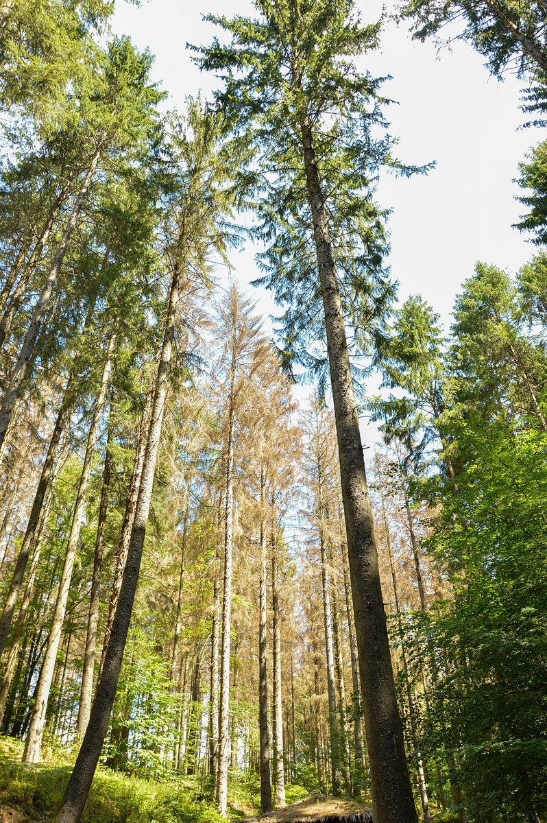En forêt du Grand Bois : la quasi-totalité des épicéas du secteur Village est touchée par le scolyte.